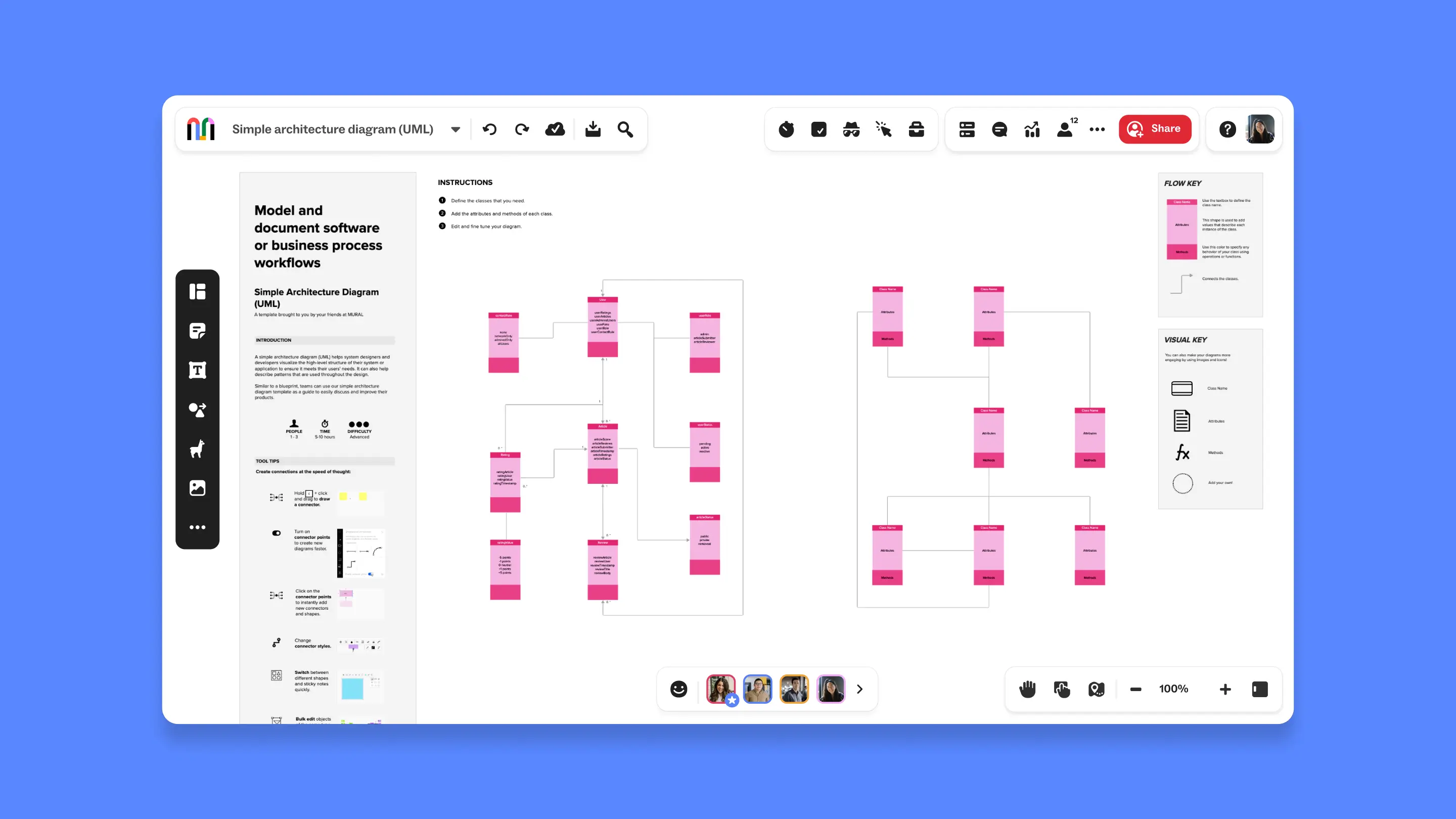 Turn complex ideas into clear visuals with collaborative online diagramming. Use Mural to create flowcharts, process diagrams, system maps, and more—while your entire team contributes in real time.